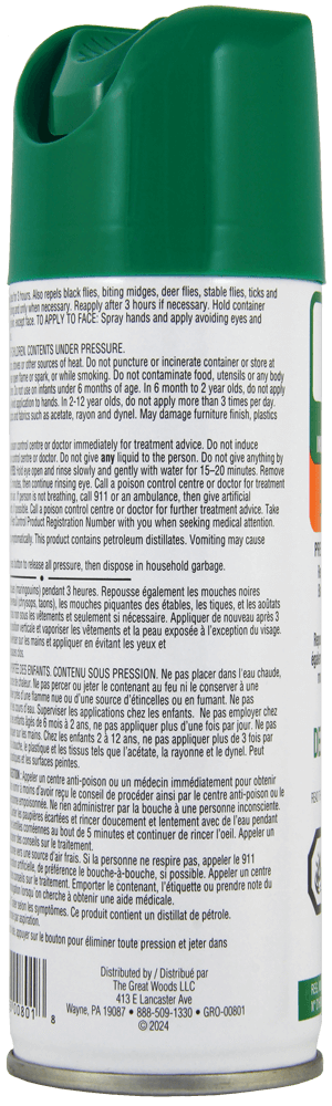 Great Outdoors Family Defense Insect Repellent with 10% DEET effectively repels Mosquitoes for up to 3 hours. Also repels Ticks, Blackflies, Biting Midges, Deer Flies, Stable Flies and Chiggers. Safe for children over 6 months of age.