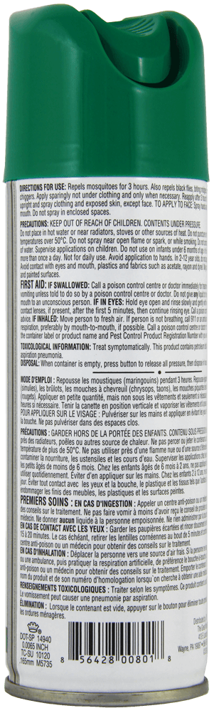 PRECAUTIONS: KEEP OUT OF REACH OF CHILDREN. CONTENTS UNDER PRESSURE. Do not place in hot water or near radiators, stove or other sources of head. Do not puncture or incinerate container or store at temperatures above 50ÂșC. Do not spray near open flame or spark, or while smoking. Do not contaminate food, utensils or any body of water. Supervise applications on children. Do not use on infants under 6 months of age. In 6 month to 2 year olds, do not apply more than once a day. Not for daily use. Avoid application to hands. In 2-12 year olds, do not apply more than 3 times per day. Avoid contact with eyes and mouth, plastics and fabrics such as acetate, rayon, and dynel. May damage furniture finish, plastics and painted surfaces.